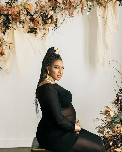 The beautiful pictures showcase Chika Ike’s elegance and joy as she cradles her baby bump in a stylish black outfit.