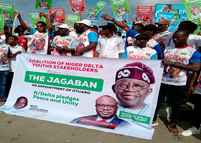 The placard-carrying youths converged on Okutukutu area of the state capital as early as 9 am adorned in T-shirts and Fez caps with the bold inscription: “We appreciate the Jagaban on appointment of Otuaro.”