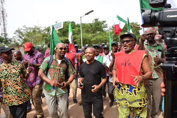 NLC President, Joe Ajaero and others at NERC headquarters Abuja over high tariffs.