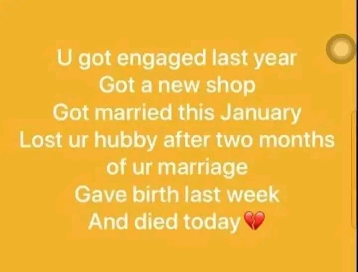 You got engaged last year, got a new shop, got married this year, lost your hubby after two months of your marriage, gave birth last week and died today.
